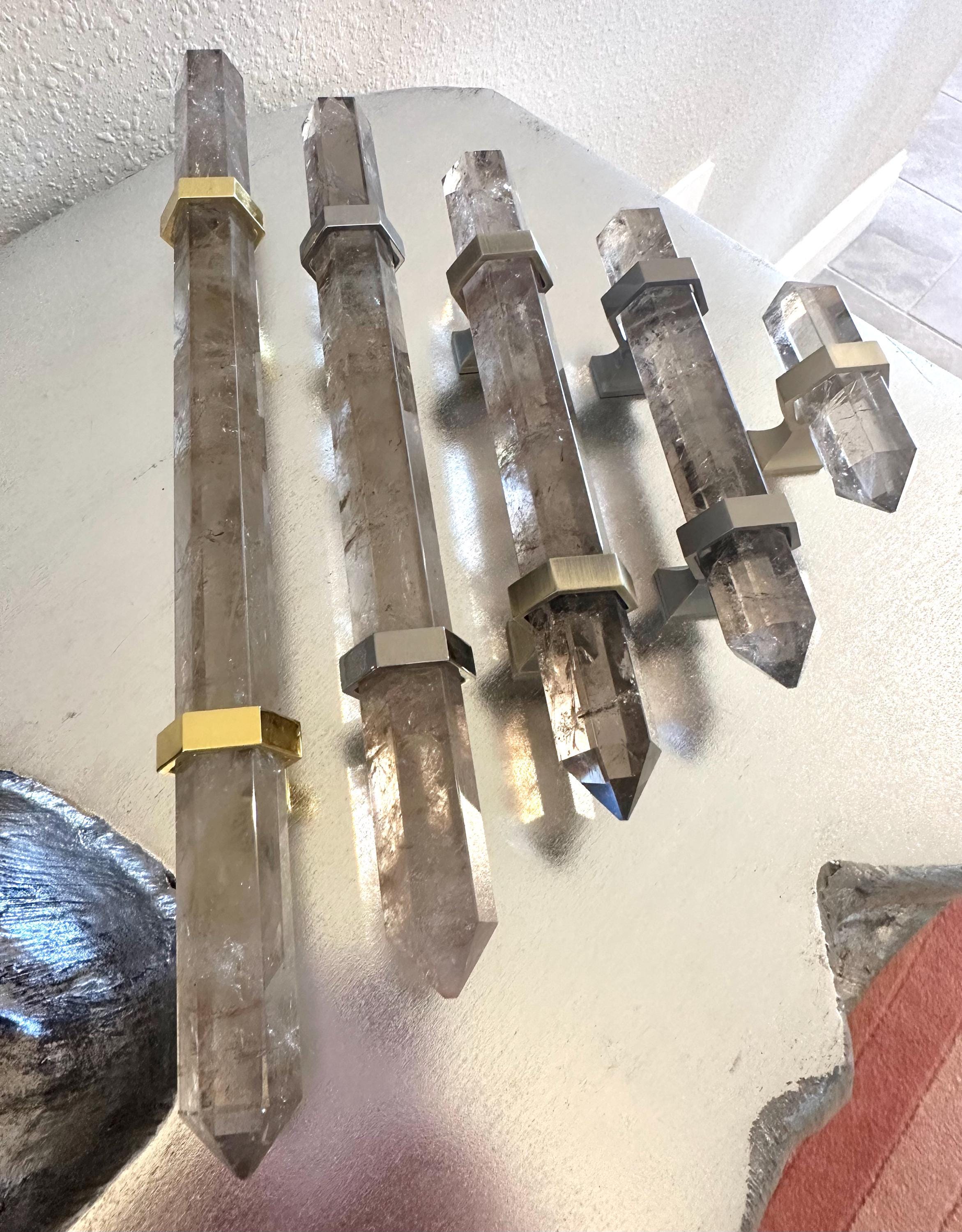 Smoky quartz is traditionally associated with grounding, protection, stress relief and transmuting negative energy into calm stability making it an ideal energetic choice for high-traffic or high-stress areas of the home while delivering one of the most versatile “neutral-with-personality” looks in luxury hardware