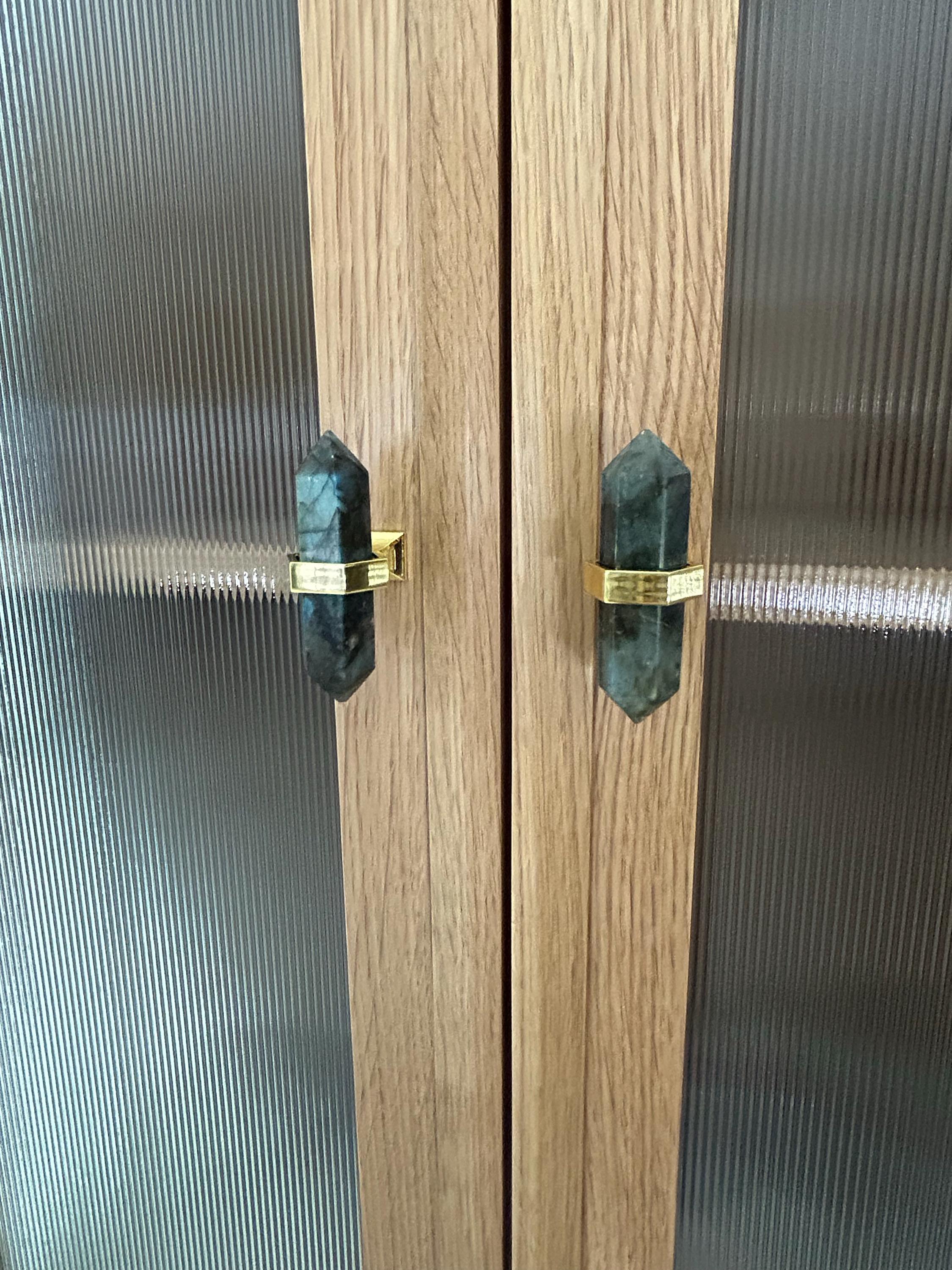 Our new collection of small crystal knobs feature expertly-cut genuine stones wrapped like a glove in solid brass hexagons. These 3" crystal drawer handles come in amethyst, rose quartz, clear quartz, labradorite, obsidian, lapis and green fluorite. The perfect hardware for dressers, vanities, desks and cabinets.
